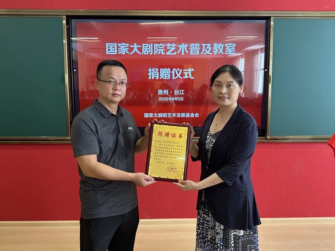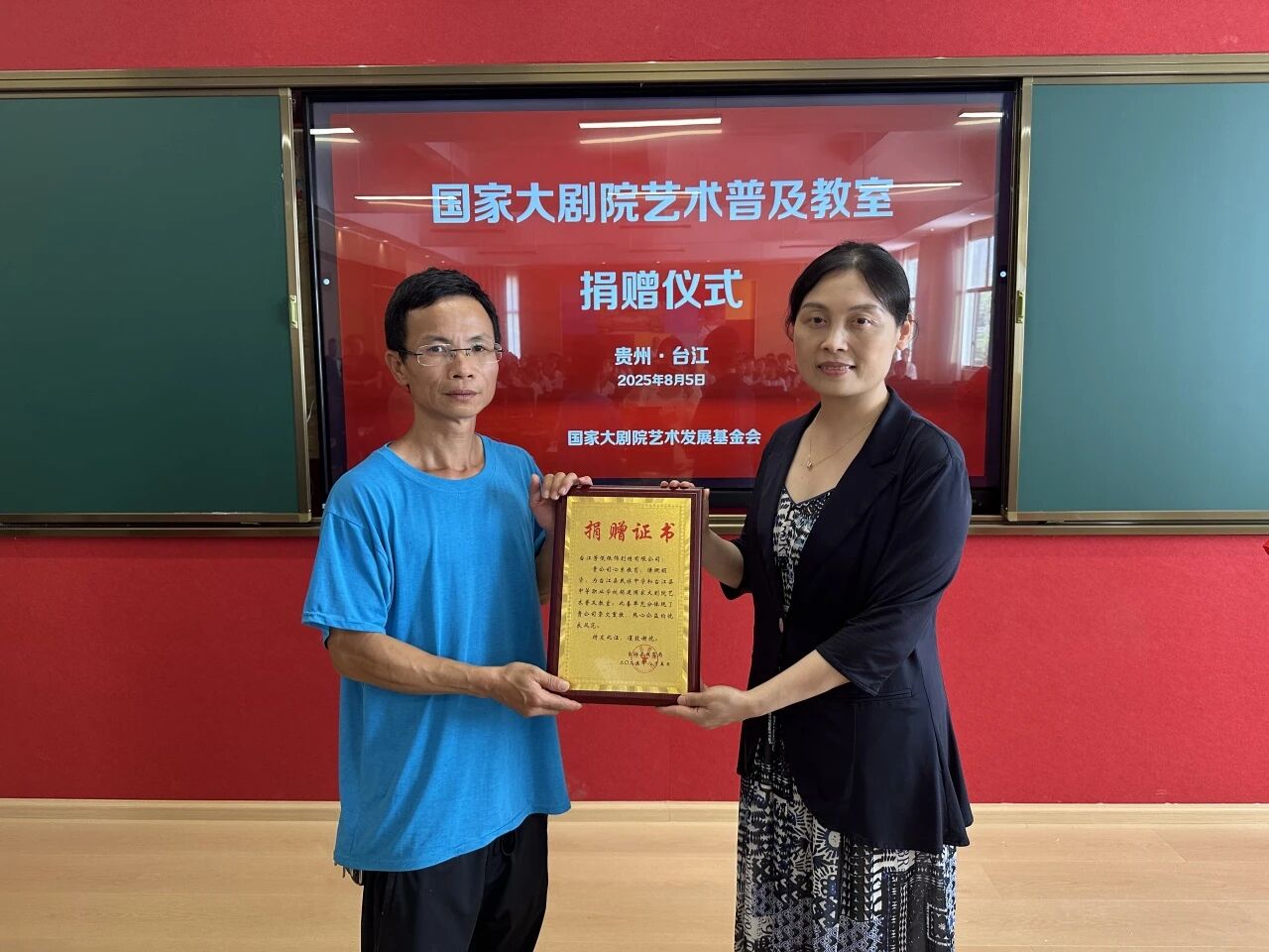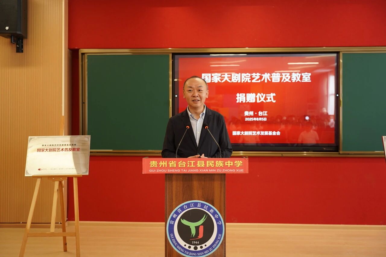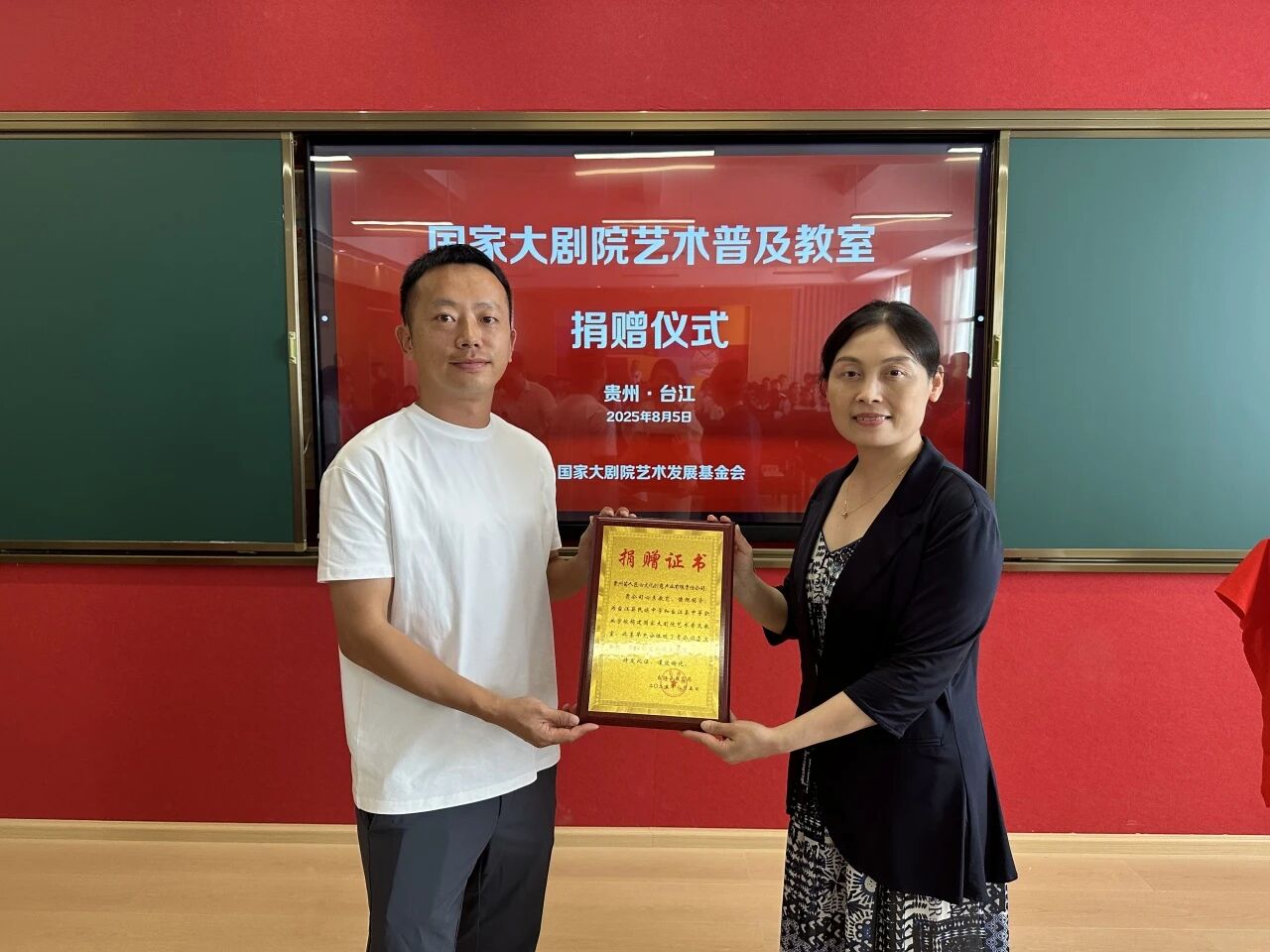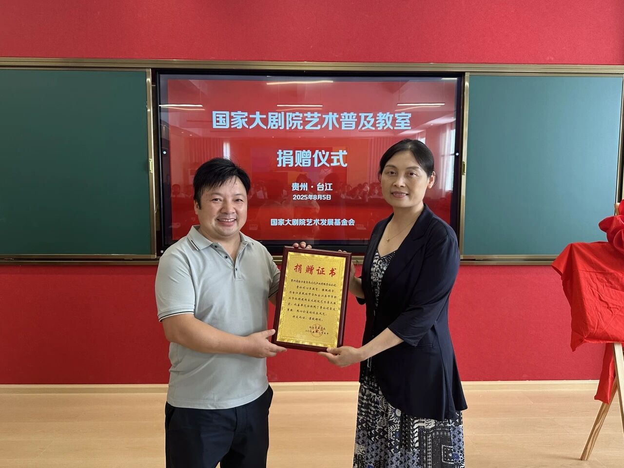 2025年8月4日-6日,国家大剧院艺术发展基金会来到苗族人口占比高达98%、拥有14项国家级非物质文化遗产的贵州省台江县捐建2间艺术普及教室,并在台江县民族中学举行艺术普及教室捐赠仪式。国家大剧院党组成员、副院长王诚率队赴贵州台江,国家大剧院发展合作部部长、基金会理事长黄文卉,艺术普及教育部部长陈戈,艺术品部部长刘欲晓共同出席。黔东南州教育局局长曾武松,台江县委副书记、县长杨德昭,县委副书记张德耀等县领导及台江县教育局主要负责同志参加此次活动。
