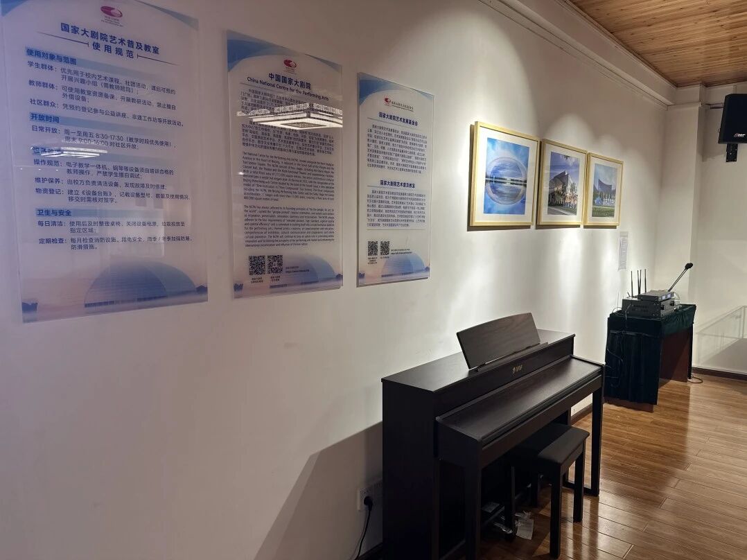 国家大剧院艺术普及教室以环保隔音材料精心打造,融合国家大剧院的设计元素,营造出专业且舒适的艺术学习环境。教室配备先进的专业教学设备,包括钢琴、合唱台、多媒体教学一体机和音响系统等,能够支持音乐、舞蹈、戏剧等多种艺术形式的教学活动。此外,教室还配备了丰富的学习资源,如国家大剧院院刊、通识课教材等图书音像资料,以及国家大剧院官网和古典音乐频道的线上微课堂和音视频资料,全方位助力艺术教育的开展。
