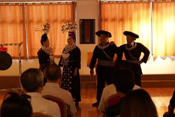 在台江县民族中学、台江县中等职业学校,台江县精心组织当地省级、州级非遗传承人以及在校师生,身着绚丽多彩的苗族传统服饰,献上精彩表演——苗岭飞歌《高高的苗岭山上》、方召情歌《阳春三月好风光》、芦笙合奏《欢乐的苗家》以及震撼的苗族反排木鼓舞,用他们独特的艺术形式展现苗族文化的独特魅力。
