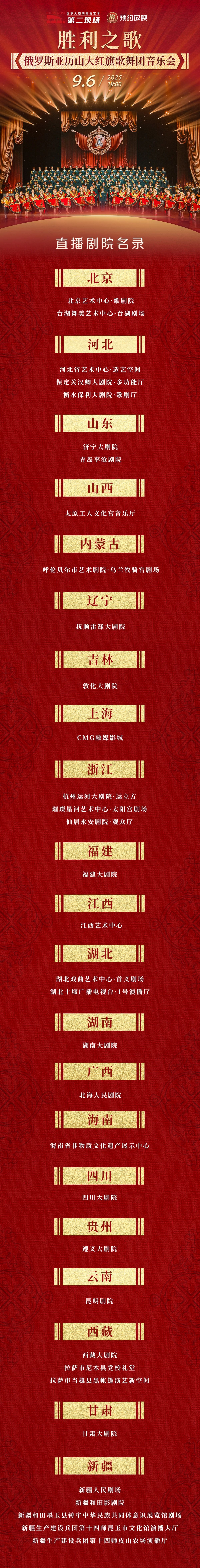 9月6日19:00,国家大剧院舞台艺术“第二现场”将在全国观众的翘首企盼中再次绽放,俄罗斯亚历山大红旗歌舞团“胜利之歌”音乐会在国家大剧院歌剧院的现场演出实况将在全国多个省、自治区、直辖市的30余家剧院和近百家影院同步直播。