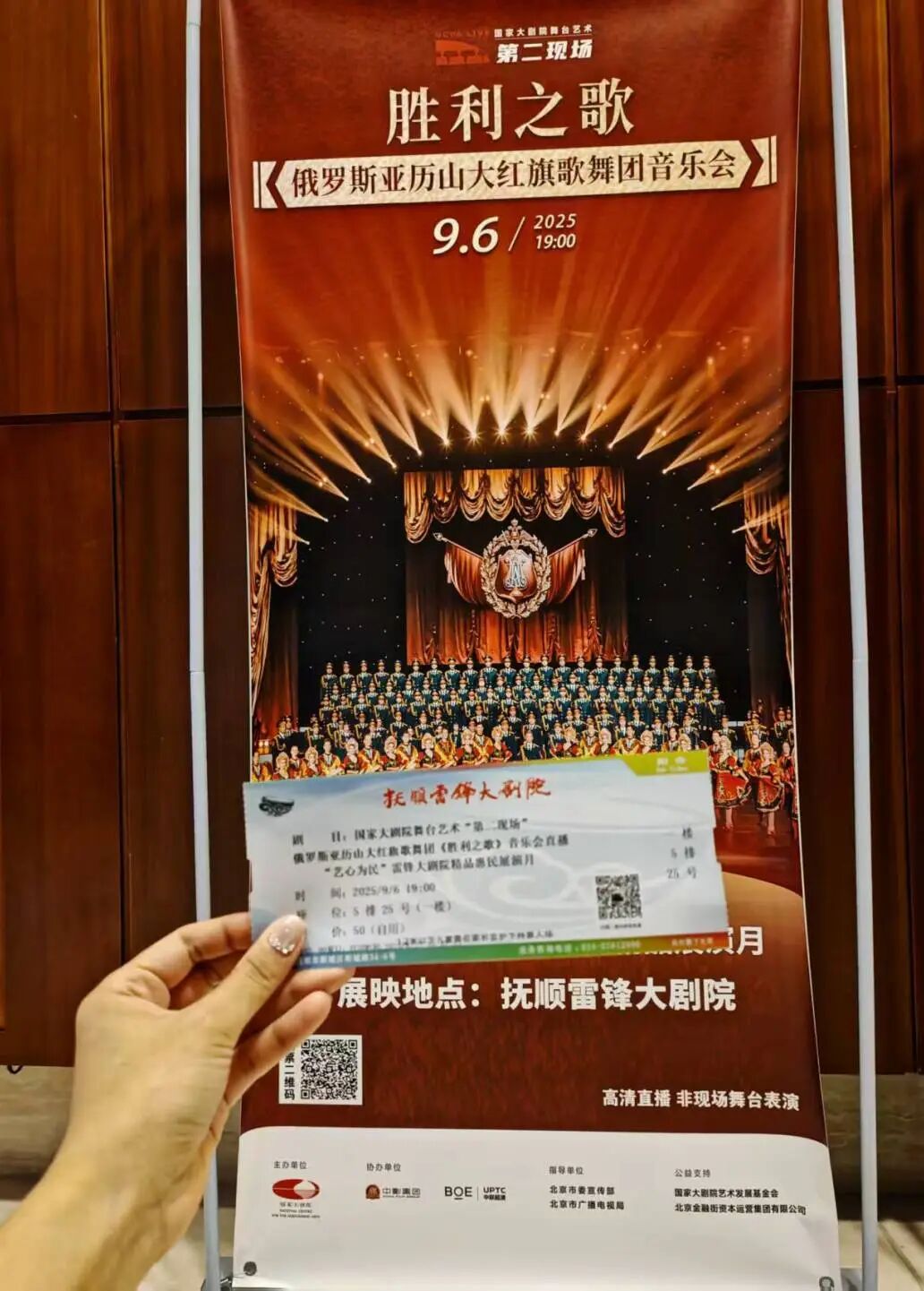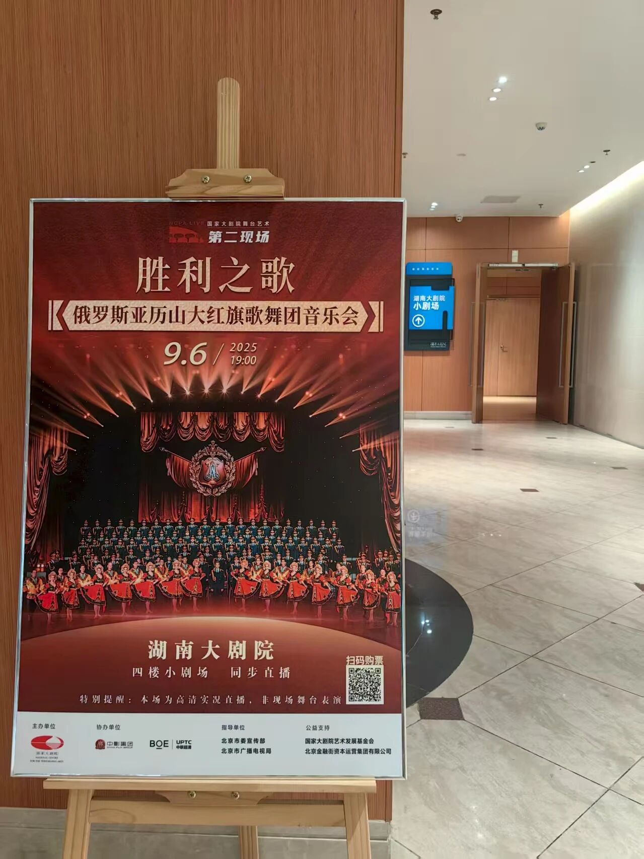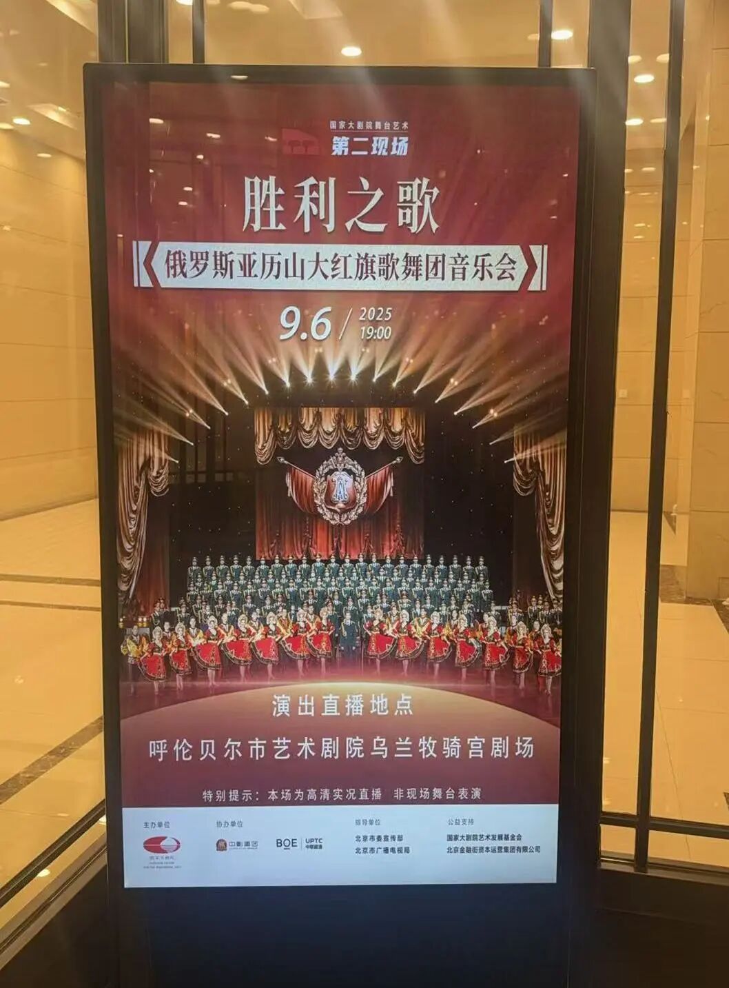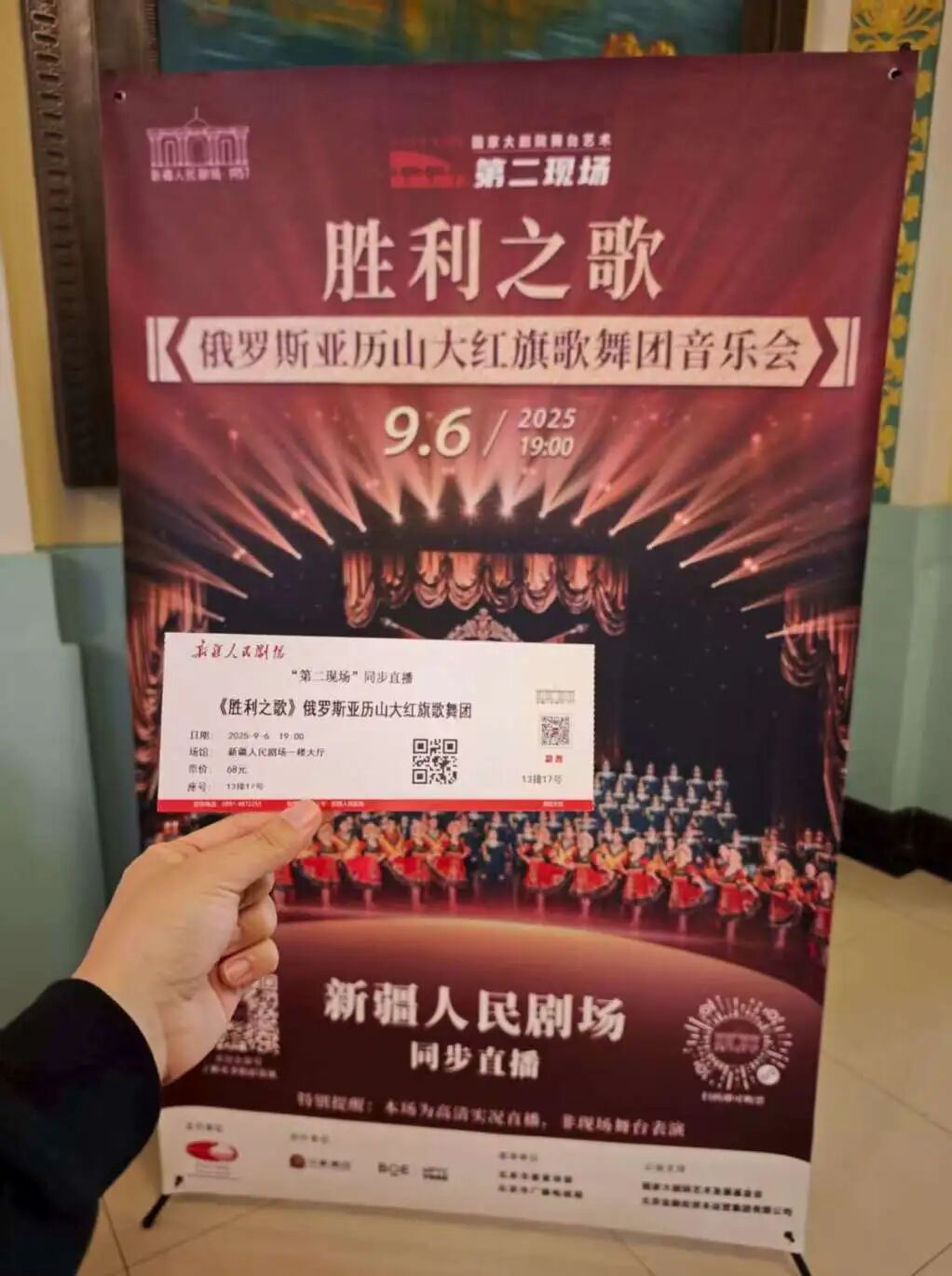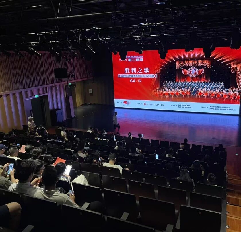 9月6日19:00,国家大剧院舞台艺术“第二现场”的第三场直播——俄罗斯亚历山大红旗歌舞团“胜利之歌”音乐会通过4K超高清+5.1环绕声技术,在北京、西藏、新疆、内蒙古、海南等全国多个省、自治区、直辖市的30余家剧院和近百家影院同步直播。