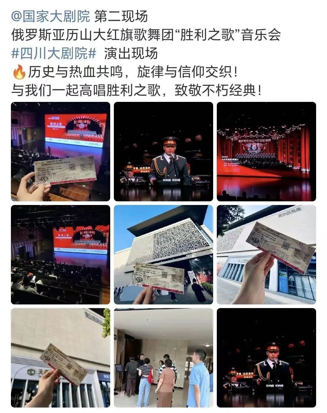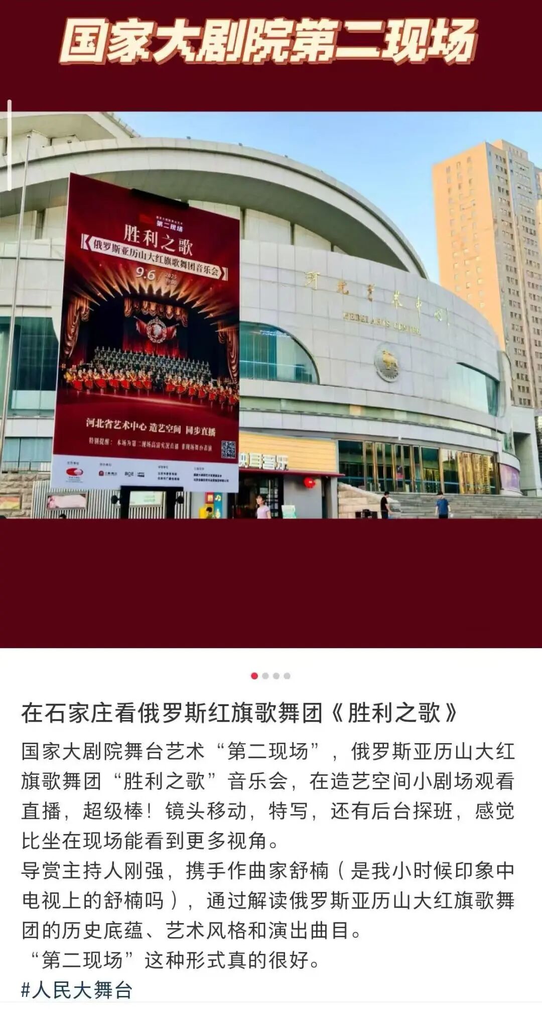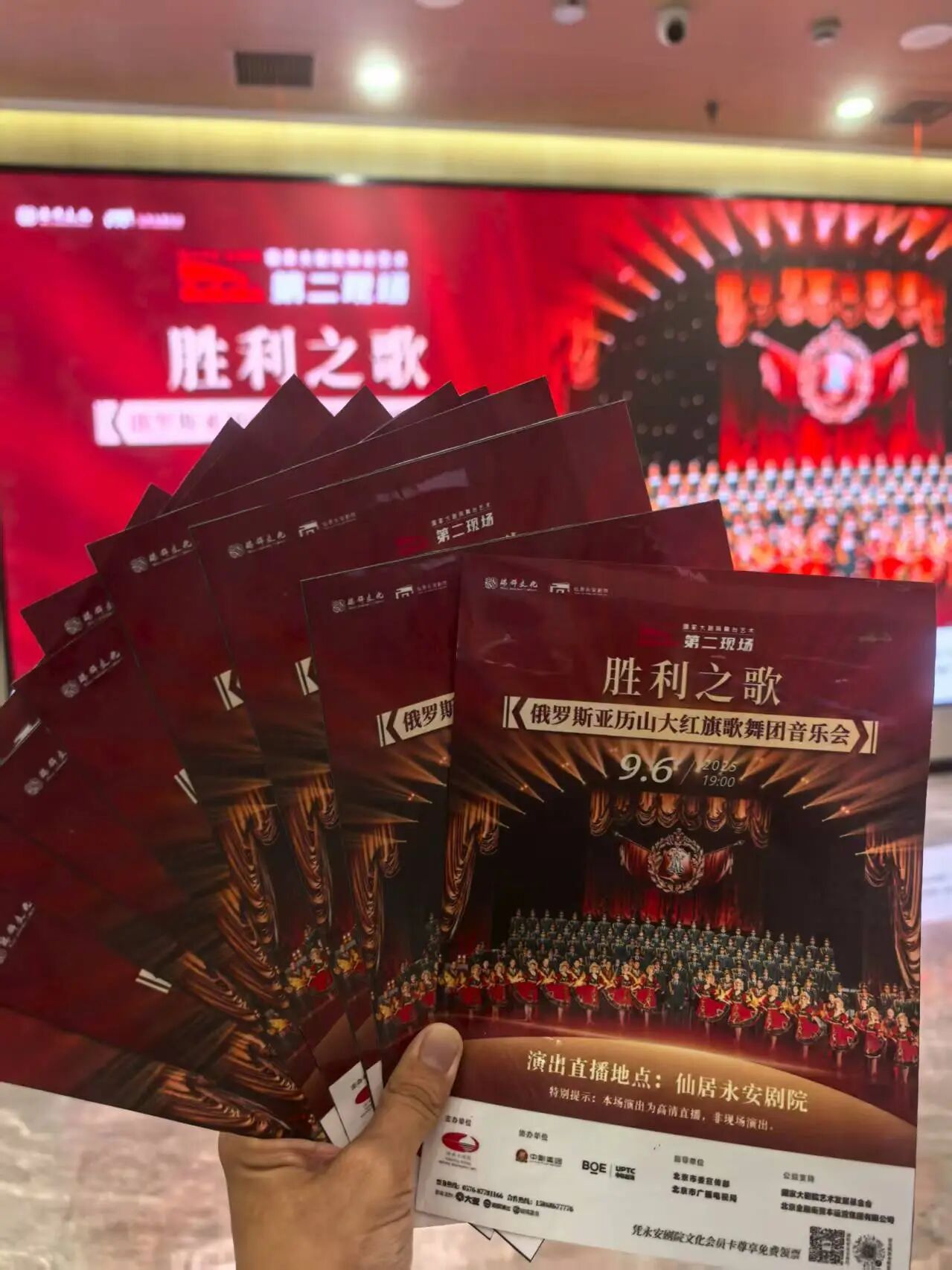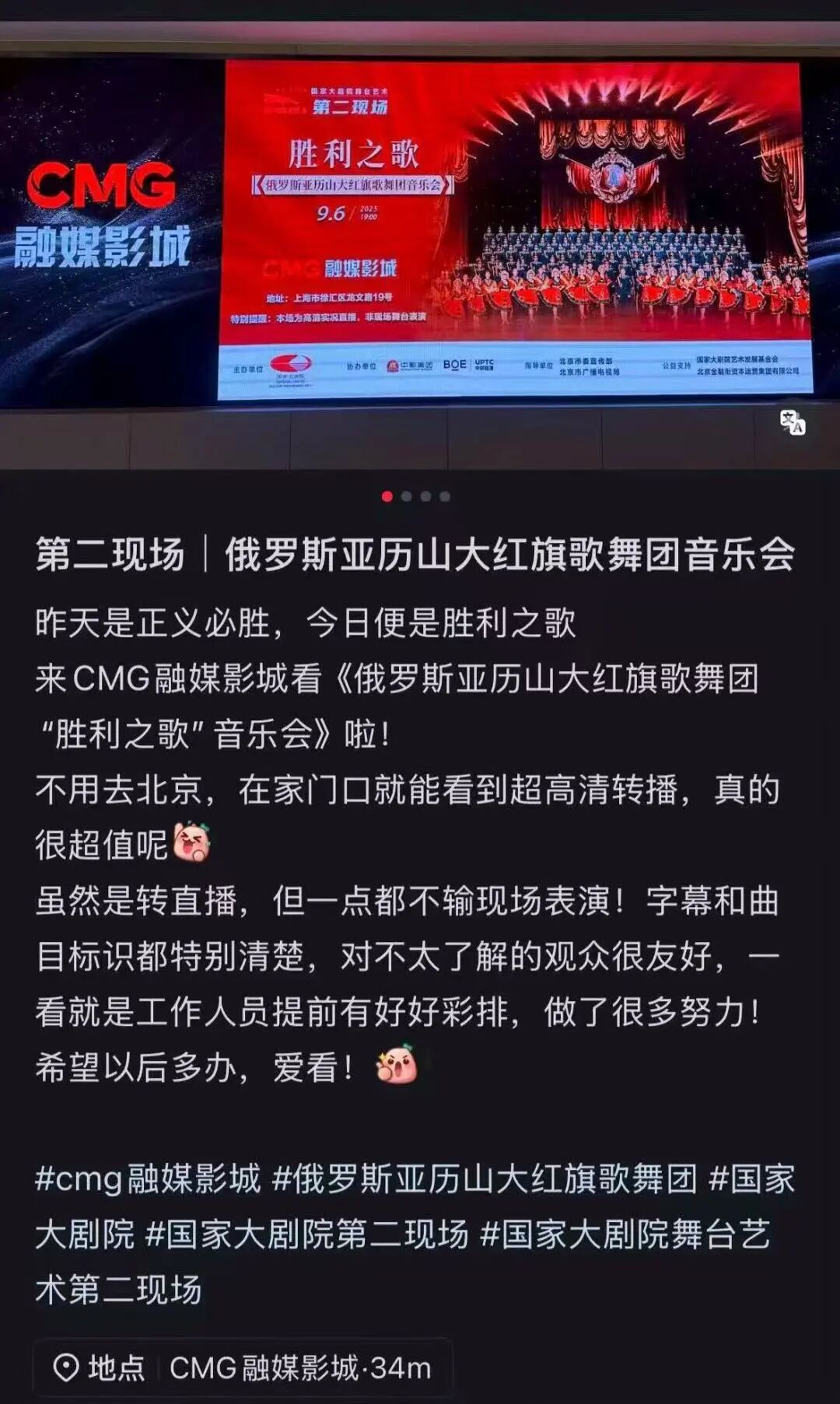 9月6日19:00,国家大剧院舞台艺术“第二现场”的第三场直播——俄罗斯亚历山大红旗歌舞团“胜利之歌”音乐会通过4K超高清+5.1环绕声技术,在北京、西藏、新疆、内蒙古、海南等全国多个省、自治区、直辖市的30余家剧院和近百家影院同步直播。
