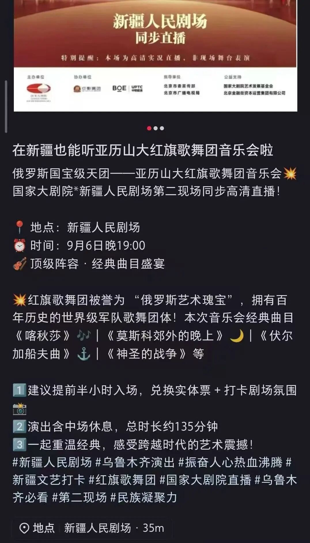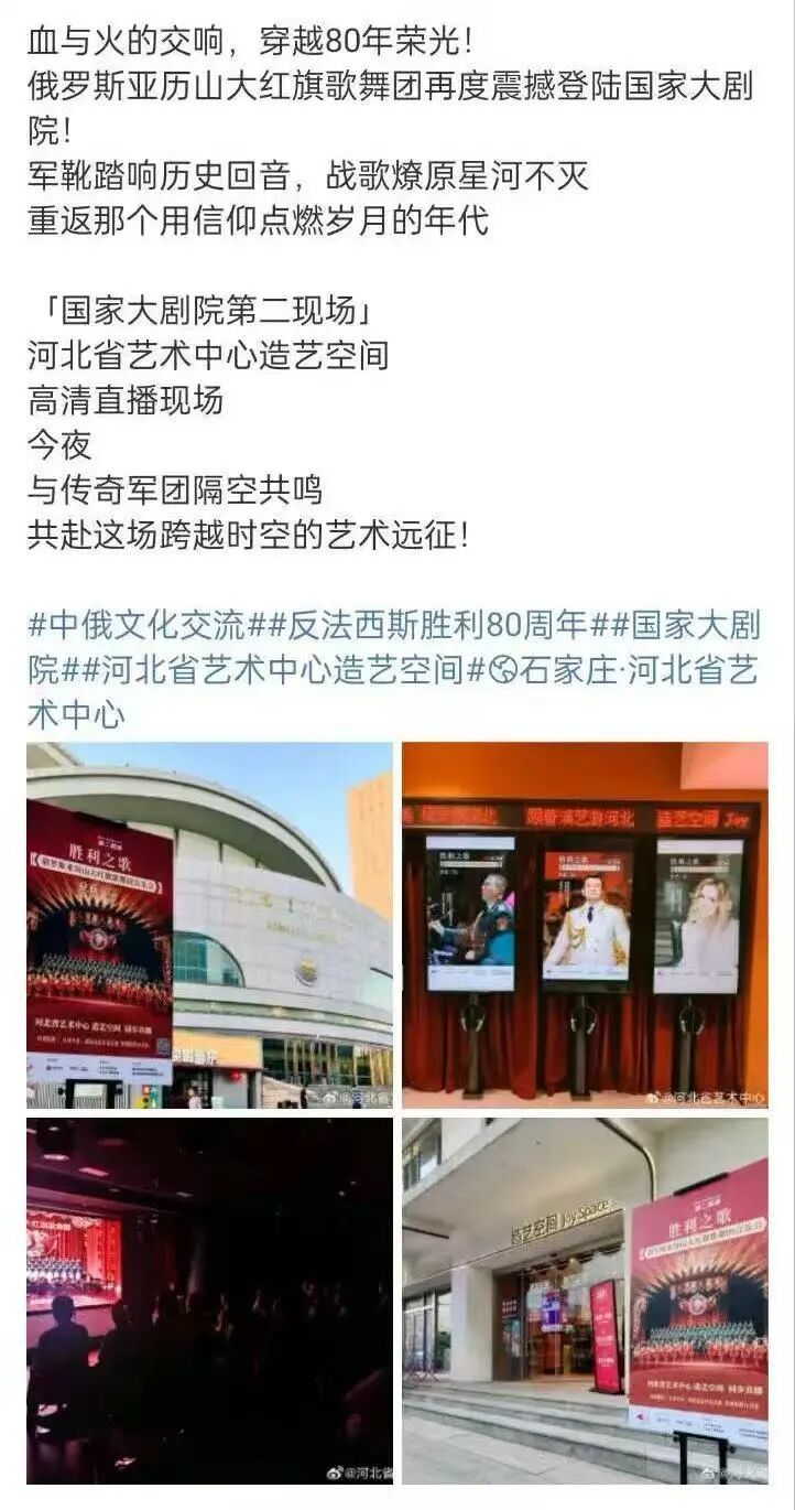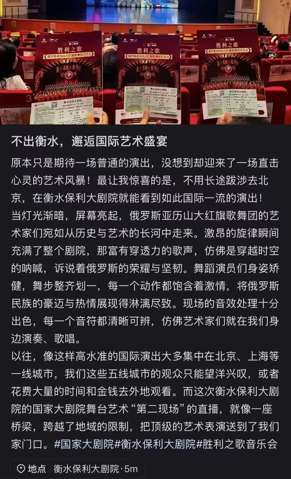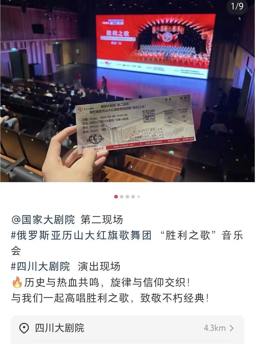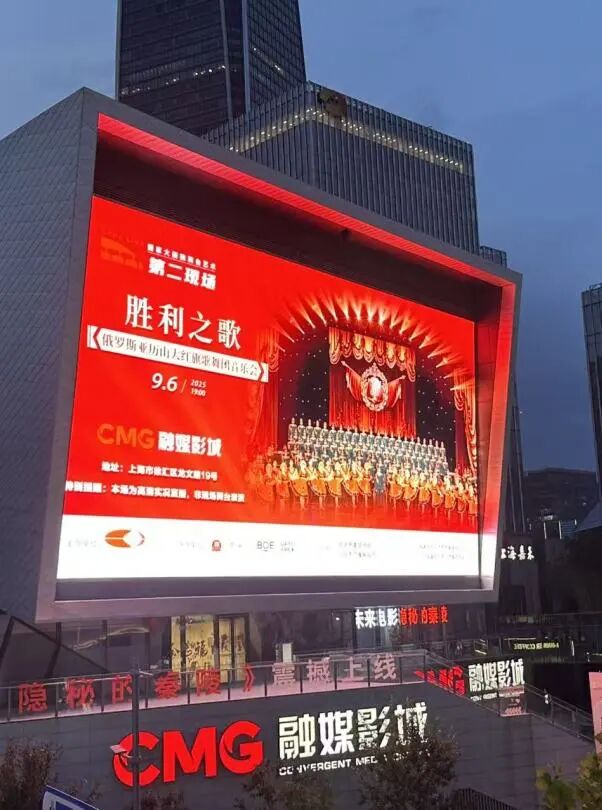 9月6日19:00,国家大剧院舞台艺术“第二现场”的第三场直播——俄罗斯亚历山大红旗歌舞团“胜利之歌”音乐会通过4K超高清+5.1环绕声技术,在北京、西藏、新疆、内蒙古、海南等全国多个省、自治区、直辖市的30余家剧院和近百家影院同步直播。