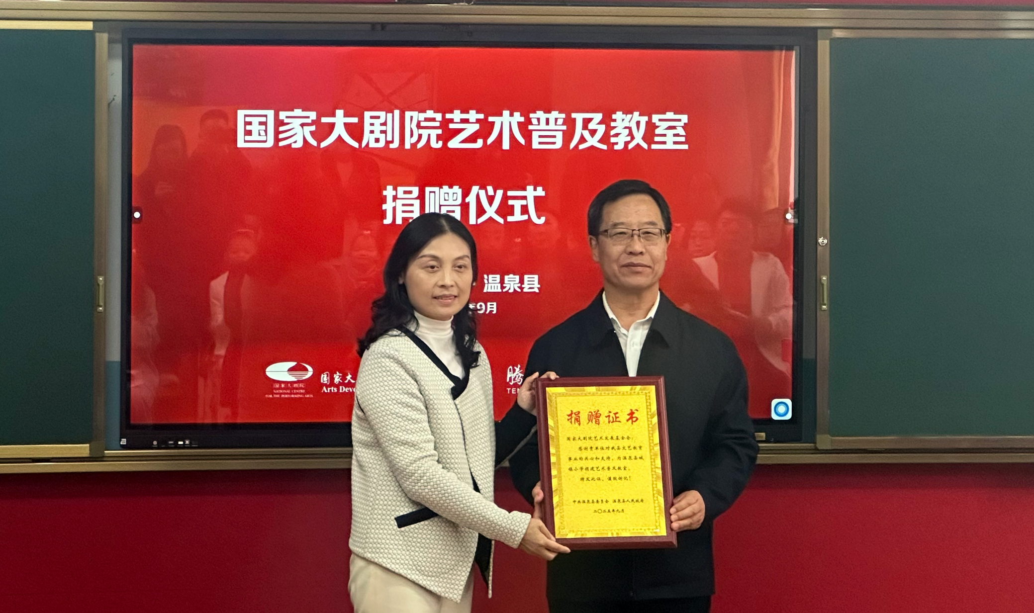 随后,双方共同为“国家大剧院艺术普及教室”揭牌,温泉县政协党组书记、主席张自贤代表温泉县向国家大剧院艺术发展基金会颁发捐赠证书,现场全体人员合影留念,定格这一意义深远的时刻。